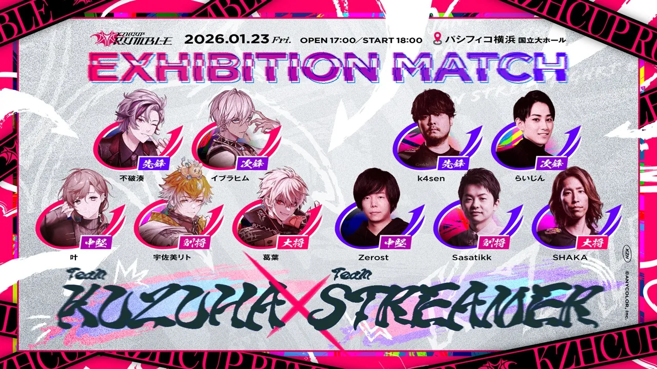 イベントは2025年12月21日(日)にオンラインで予選(総当たり戦・BO3形式)を実施。上位3チームが翌年2026年1月23日(金)にパシフィコ横浜で開催される決勝戦へと駒を進めます。決勝戦当日には、葛葉チームとSHAKA氏、k4sen氏らストリーマーチームによる5対5のエキシビションマッチも予定されており、予選・決勝ともに配信が行われます。